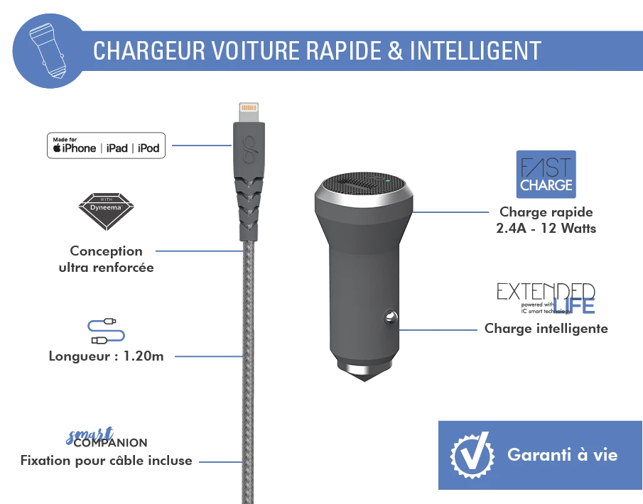 Contenu du pack 1 Chargeur voiture USB Lightning + 1 Câble USB A/Lightning + 1 carte de garantie à vie + 1 Smart Compagnon