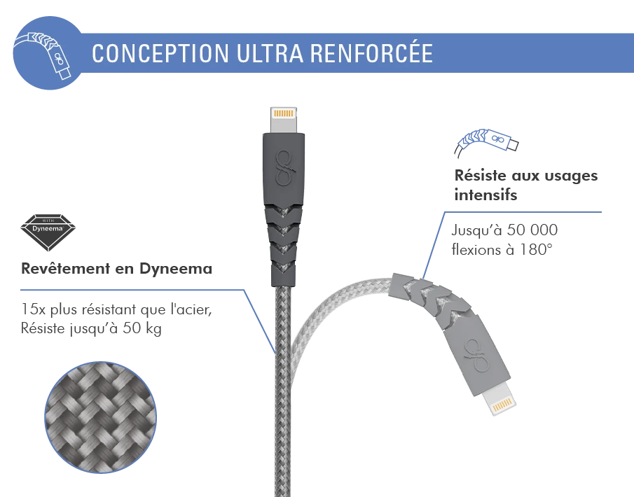 L’alliance parfaite d’un câble renforcé câble à la résistance extrême et d’un chargeur haute performance pour une charge rapide au quotidien.
