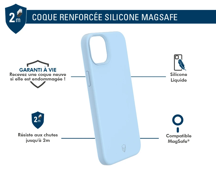 La coque renforcée Silicone MagSafe résiste aux chocs et aux chutes de 2 mètres.