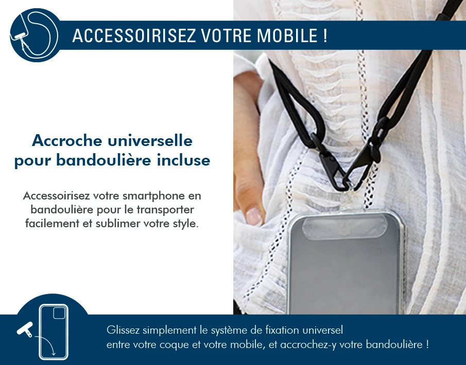 Accessoirisez votre smartphone en bandoulière pour le transporter facilement et sublimer votre style. Glissez simplement le système de fixation universel entre votre coque et votre mobile, et accrochez-y votre bandoulière.