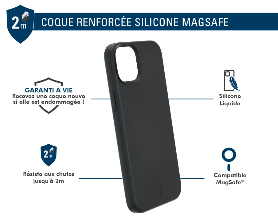 La coque renforcée Silicone MagSafe résiste aux chocs et aux chutes de 2 mètres.