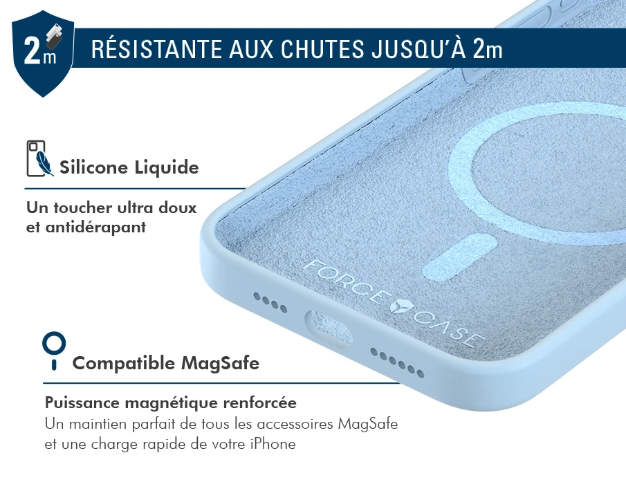 La coque renforcée Silicone MagSafe résiste aux chocs et aux chutes de 2 mètres.