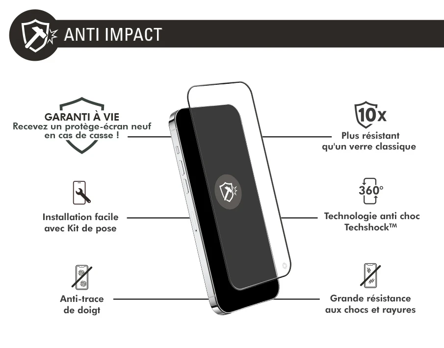 Technologie TechShock 360°™ pour neutraliser les impacts latéraux sur les contours de l’écran. Conception exclusive qui combine les meilleurs matériaux, traitements et revêtements pour garantir le plus haut niveau de résistance aux rayures, à la pression et aux chocs.