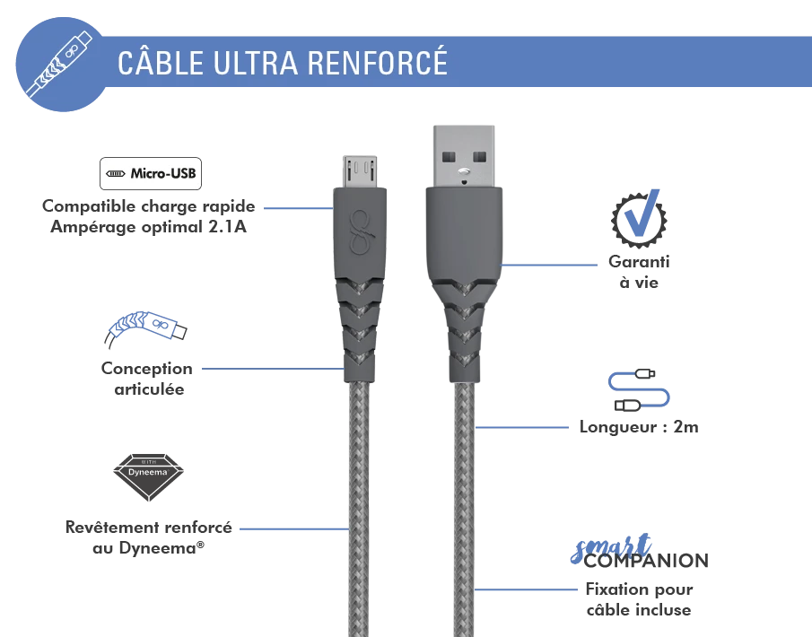 Contenu du pack 1 Câble USB A/micro USB de 2 m + 1 carte de garantie à vie + 1 Smart Compagnon