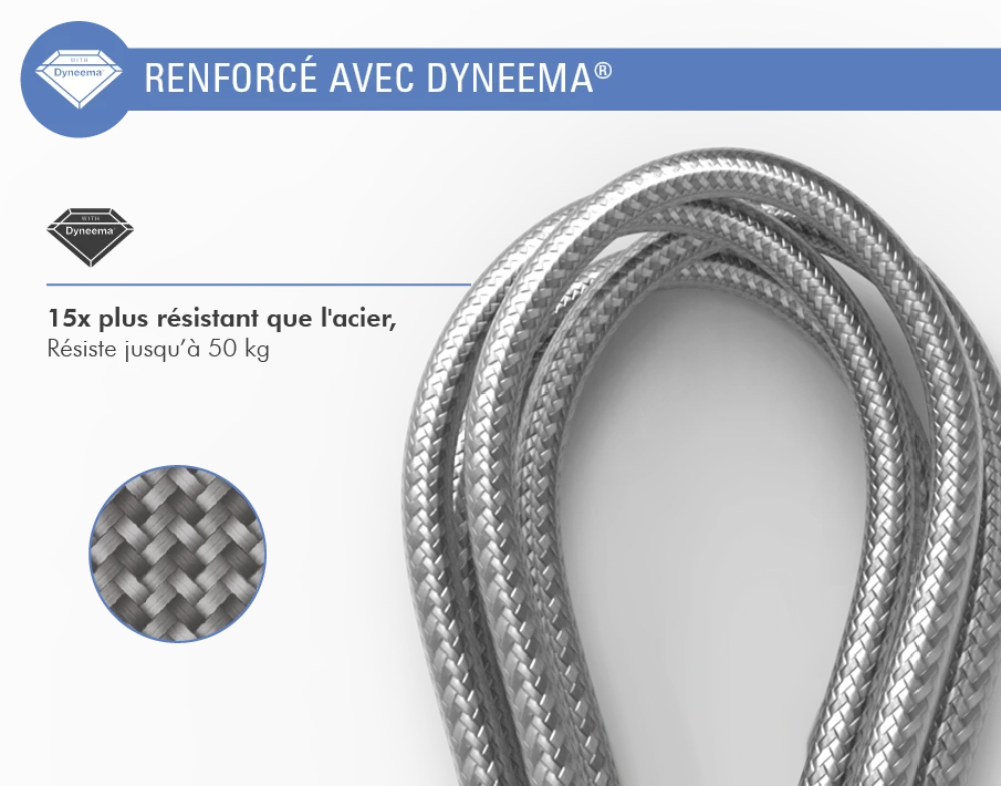 Revêtement en Dyneema® 15 fois plus résistant que l’acier qui offre une résistance aux tractions jusqu’à 50 kg.
