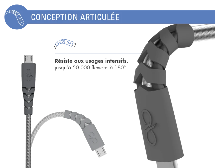 Conçu pour être plié et résister jusqu’à 50 000 flexions à 180° sans endommager votre câble