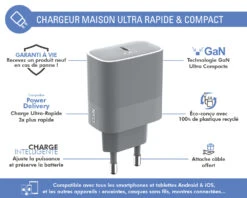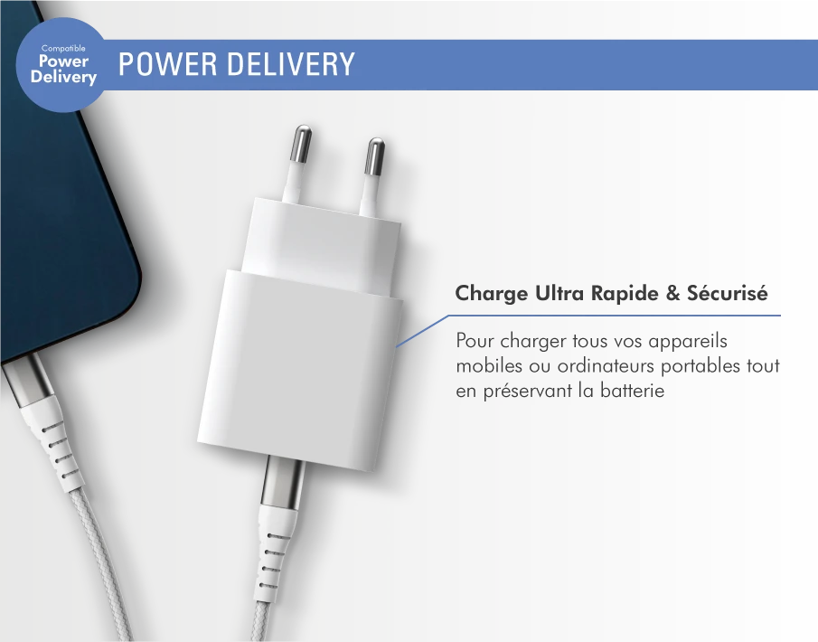 Pour bénéficier de la vitesse de charge optimale d’un chargeur Power Delivery, vous avez besoin d’un appareil Apple ou Android compatible avec cette technologie, un câble de charge USB type C vers USB type C ou Lightning vers USB type C et d’un chargeur compatible USB-PD.