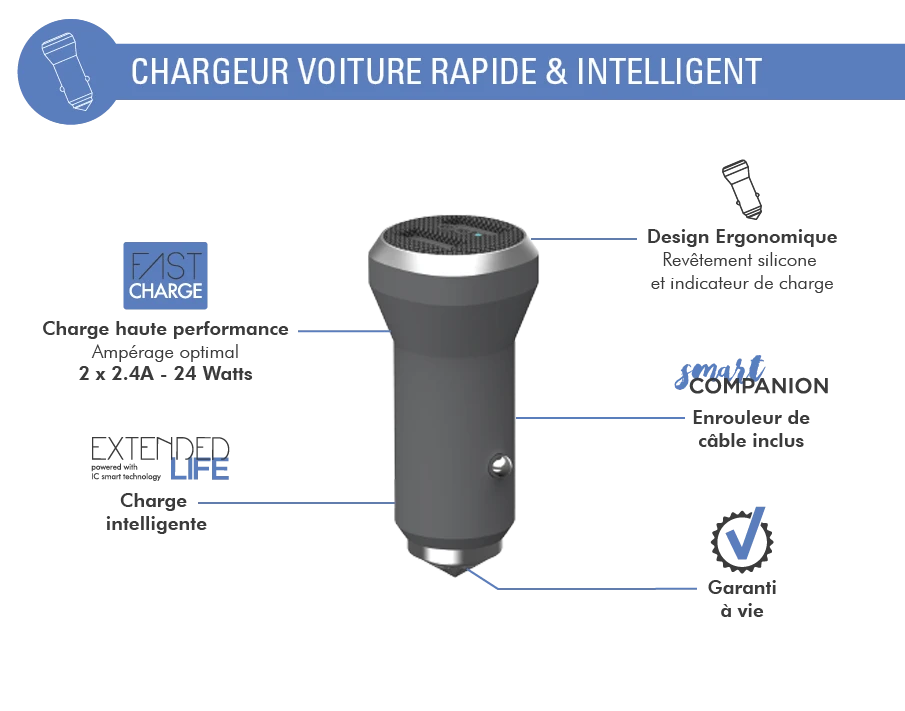 Contenu du pack 1 Chargeur voiture USB Universel + 1 carte de garantie à vie + 1 Smart Compagnon