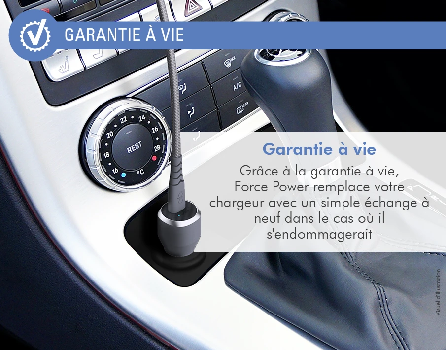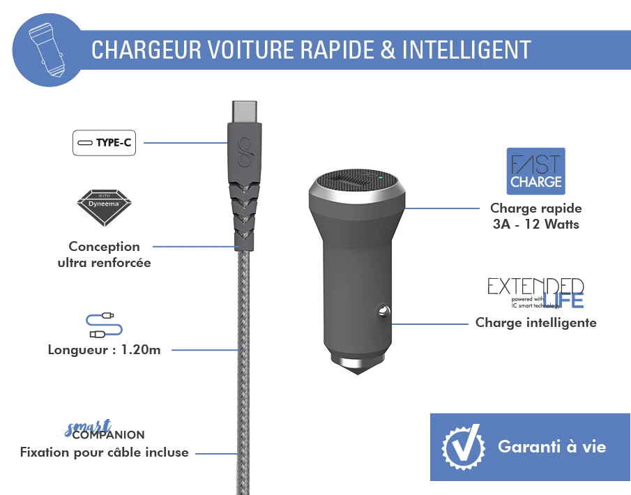 Contenu du pack 1 Chargeur voiture USB USB C + 1 Câble USB A/USB C + 1 carte de garantie à vie + 1 Smart Compagnon
