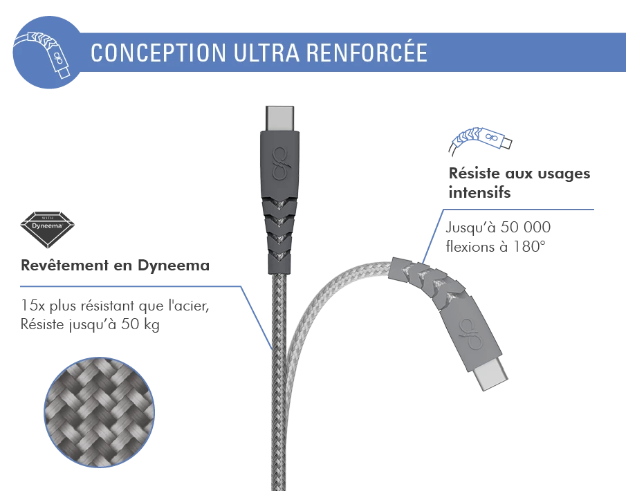 Conçu pour être plié et résister jusqu’à 50 000 flexions à 180° sans endommager votre câble.