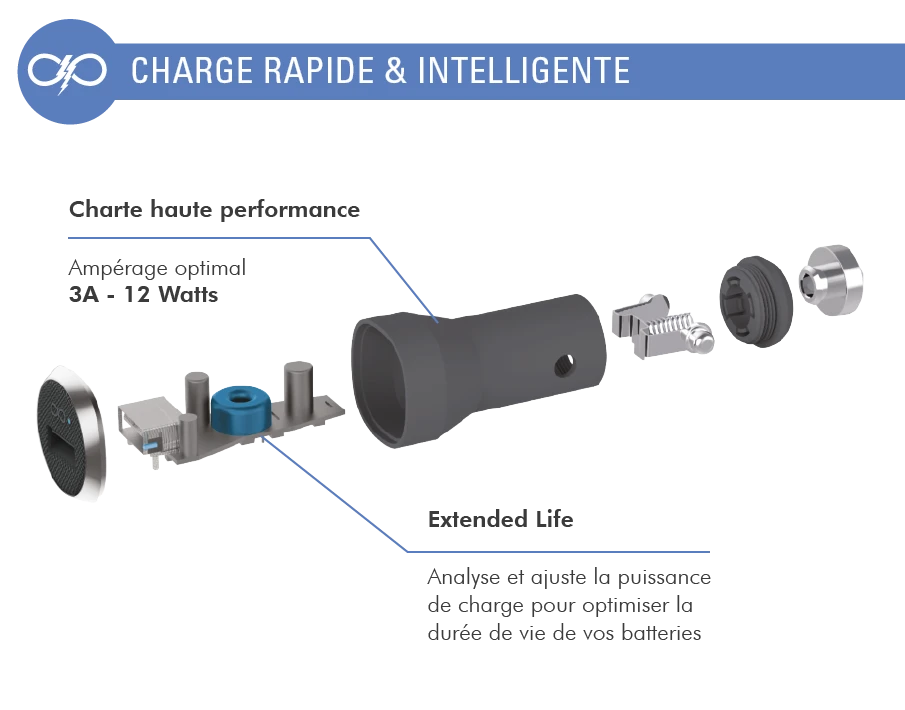 Un rechargement 2 à 3 fois plus rapides qu’avec un chargeur classique.