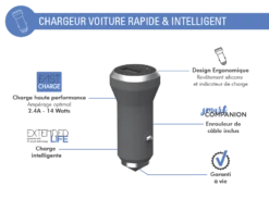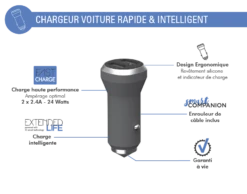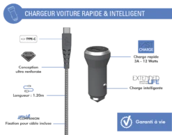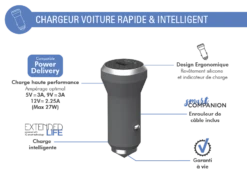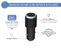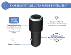 Double Chargeur Voiture USB A+C PD 37W (12+25W) Power Delivery Garanti à Vie Noir Force Power Lite