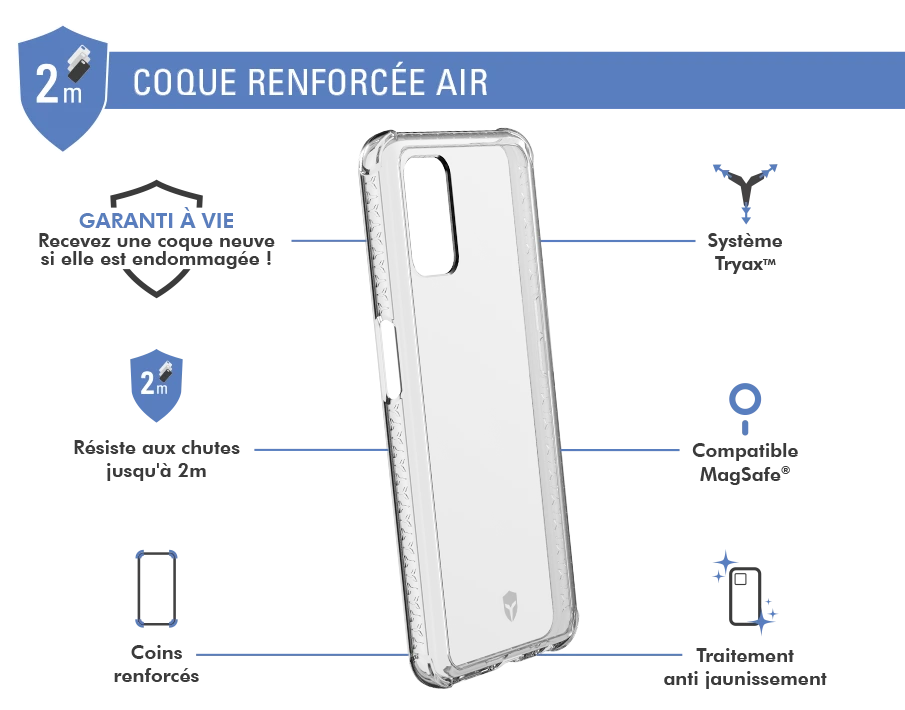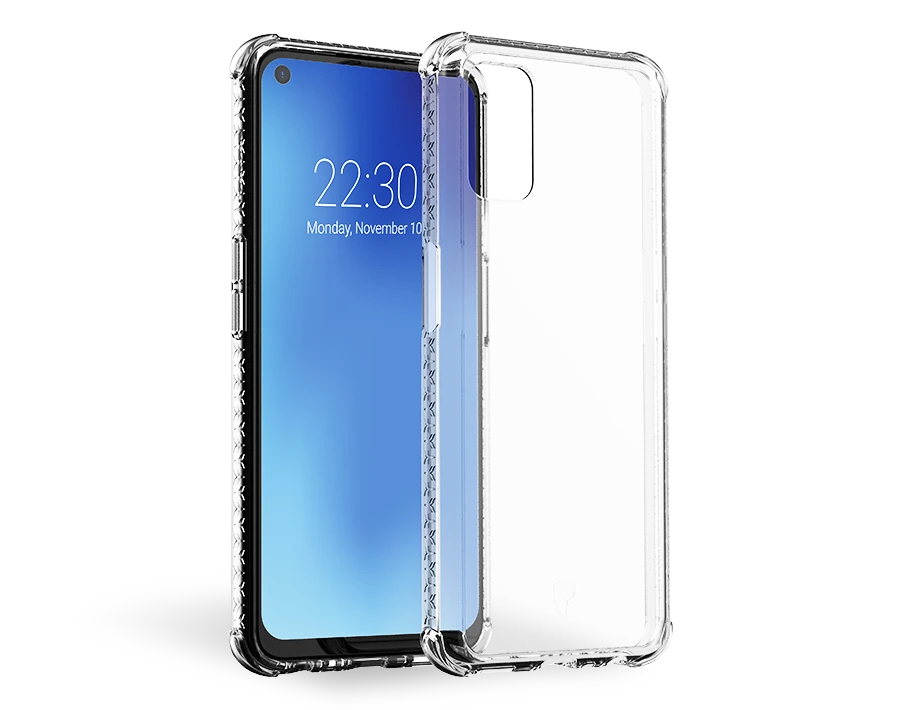 Inserts 3D sur les coins de la coque conçus pour absorber les impacts et disperser l’énergie du choc selon trois axes. Votre mobile est ainsi parfaitement protégé en cas de chute.