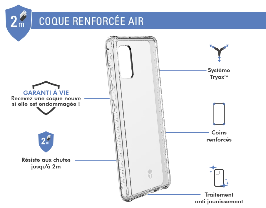 Inserts 3D sur les coins de la coque conçus pour absorber les impacts et disperser l’énergie du choc selon trois axes. Votre mobile est ainsi parfaitement protégé en cas de chute.