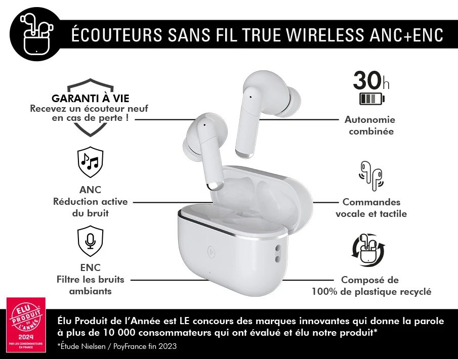 Les deux écouteurs ont un microphone intégré. Vous pouvez donc utiliser les écouteurs individuellement (droite ou gauche) ou les deux ensembles pour un son stéréo. Il n’y a donc pas de limitations avec les Twins ANC.