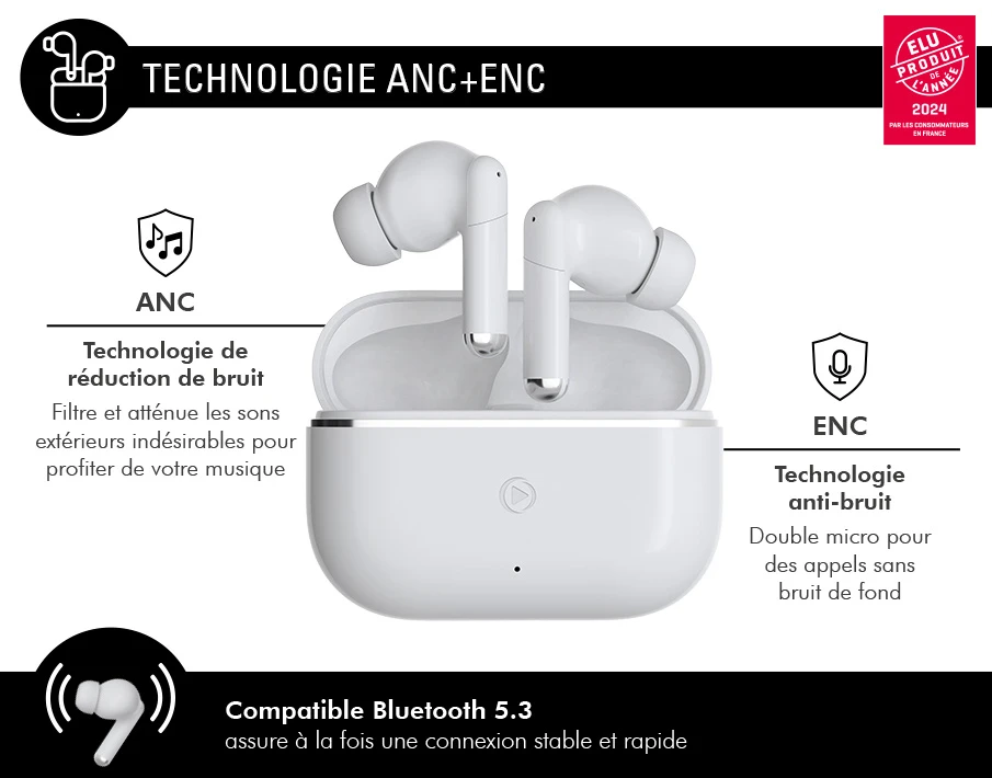 Technologie de réduction de bruit active qui filtre et atténue les sons extérieurs indésirables. L’ANC vous offre une immersion totale pour profiter pleinement de votre musique. Elle est également idéale pour les appels téléphoniques. En filtrant les bruits de fond, vous pouvez vous concentrer pleinement sur votre conversation et communiquer clairement, même dans des environnements bruyants.
