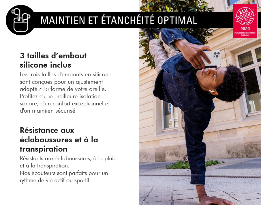 Résistants aux éclaboussures, à la pluie et à la transpiration, nos écouteurs sont parfaits pour un rythme de vie actif ou sportif. Le compagnon idéal pour le travail comme pour les loisirs, sans craindre les projections d’eau ou la sueur !