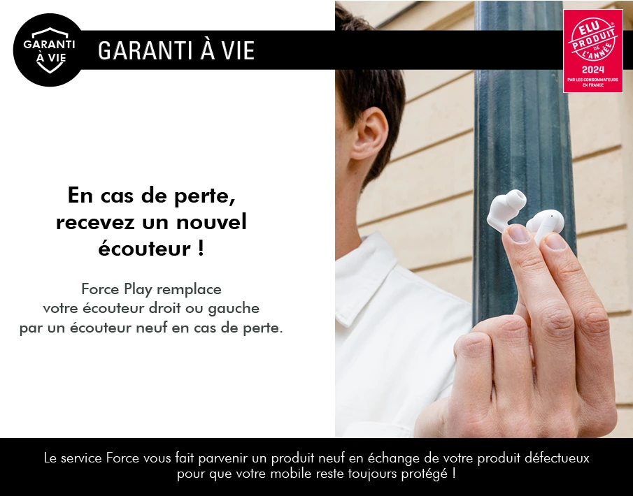Nos écouteurs Force Play sont éco-conçus et composés de plastique recyclé pour réduire l’impact environnemental.
