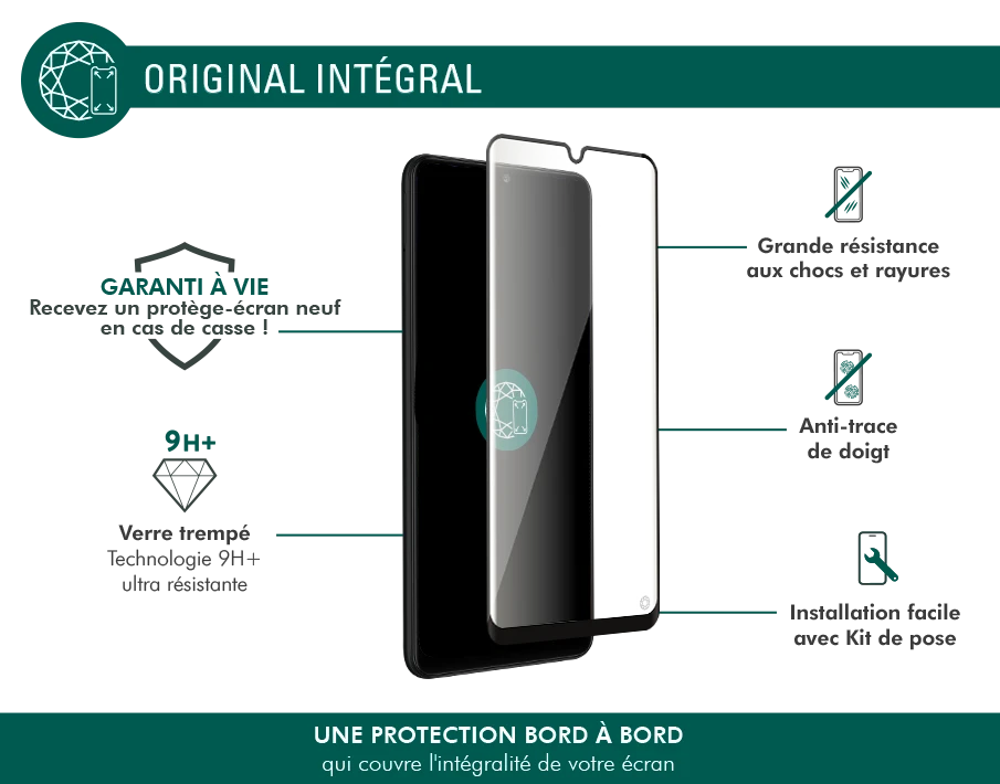 Traitement oléophobique anti-traces de doigts et conception anti-explosion qui évite les fragments dangereux et permet de le retirer facilement. Installation facile et sans loupé Kit de pose exclusif dédié pour chaque mobile pour une installation simple. rapide et sans bulle. Garantie à vie